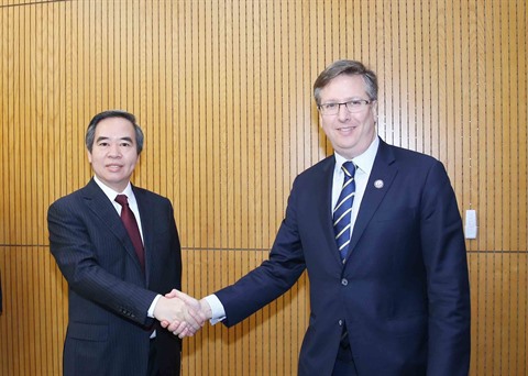 | Nguyên Van Binh, membre du Politburo et chef de la Commission économique du Comité central du PCV (gauche) a reçu à Hanoi le 5 mars, la délégation de l'USABC. |