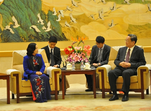 | La vice-présidente du CC du Front de la Patrie du Vietnam, Bùi Thi Thanh, et le président du Comité national de la Conférence consultative politique du peuple chinois, Yu Zhengsheng. |