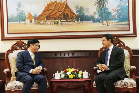 | Le vice-ministre vietnamien des Affaires étrangères Nguyên Quôc Cuong (gauche), le vice-ministre laotien des Affaires étrangères, Khamphau Onthavan, le 20 mai à Vientiane. |