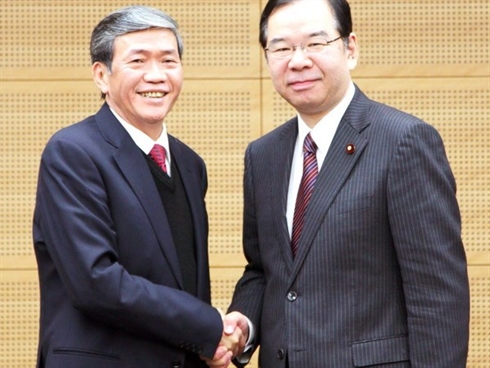 | Le président du présidium du Comité central du PCJ, Shii Kazuo (droite), et le président du Conseil de la théorie du Comité central du PCV, Dinh Thê Huynh, le 18 décembre à Tokyo. |