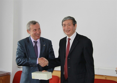| Dinh Thê Huynh (droite) et Andreï Klimov, chef adjoint de la Commission des affaires internationales du Conseil de la Fédération russe (Chambre haute du Parlement), et membre du Parti Russie unie. |