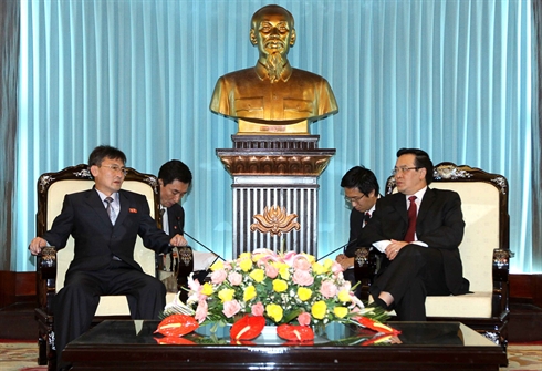 | Le chef de la Commission des relations extérieures du CC du PCV, Hoàng Binh Quân (droite), et le rédacteur en chef adjoint du quotidien Rodong Sinmun, Ri Kyong Sop, le 12 novembre à Hanoi. |