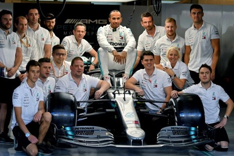 | Le Britannique Lewis Hamilton (centre) pose, entouré des membres de l'écurie Mercedes, sur le circuit de Yas Marina à Abou Dhabi, le 28 novembre. |