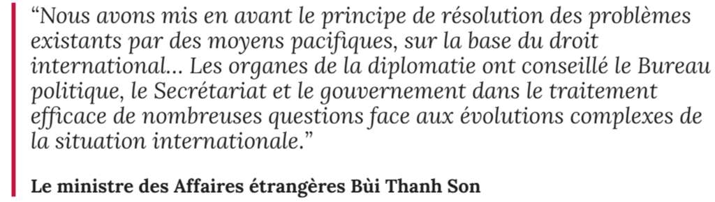 Environ 60 activités diplomatiques ont été menées par les dirigeants du pays, comprenant 21 visites officielles à l'étranger et participations à de grandes conférences multilatérales, ainsi que l'accueil de 25 délégations de dirigeants étrangers en visite au Vietnam.