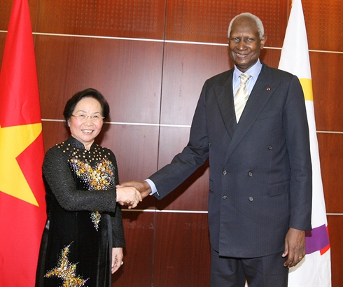 La dirigeante vietnamienne a estimé les efforts de l'OIF et de son secrétaire général Abdou Diouf pour empêcher et régler les conflits, les désaccords entre les pays par des mesures pacifiques, dans le respect du droit international et de la Charte de l'ONU.