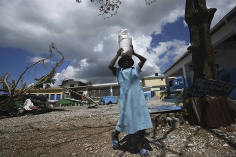 | Une victime de l'ouragan Matthew transporte de l'aide distribuée par l'ONU à Port-Salut en Haïti le 12 octobre. |