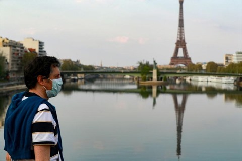 | Un passant portant un masque traverse un pont sur la Seine à Paris, le 11 avril |