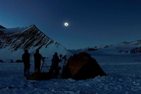 | Photo prise par Imagen Chile montrant l'éclipse solaire observée le 4 décembre, depuis le camp de l'Union Glacier en Antarctique. |