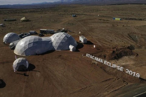 | Vue aérienne le 1er juillet du campement astronomique de Vallenar, dans le désert d'Atacama, au Chili, où l'on attent des milliers de touristes pour observer le 2 juillet une éclipse totale de soleil. |