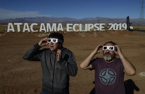 | Des touristes essaient des lunettes spéciales pour l'éclipse totale de soleil, le 1er juillet au campement astronomqiue de Vallenar, dans le désert d'Atacama, au Chili. |