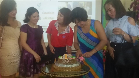 | La violiste Nguyêt Thu (2e à droite) coupe le gâteau d'anniversaire de SforA School, le 5 juin à Hanoi. |