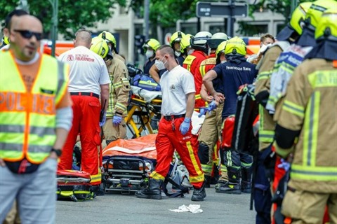 | Des équipes de secours sur le site où une personne a été tuée et plusieurs blessées percutées par une voiture, le 8 juin à Berlin. |