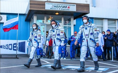 | Photo prise et publiée le 5 octobre par Roscosmos des membres de l'équipage russe du vaisseau Soyouz : le cosmonaute Anton Chkaplerov (centre), l'actrice Ioulia Peressild (gauche) et le réalisateur Klim Chipenko sur le cosmodrome de Baïkonour au Kazakhstan. |