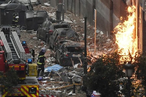 | Des pompiers à proximité d'un immeuble détruit par une explosion à Madrid le 20 janvier. |