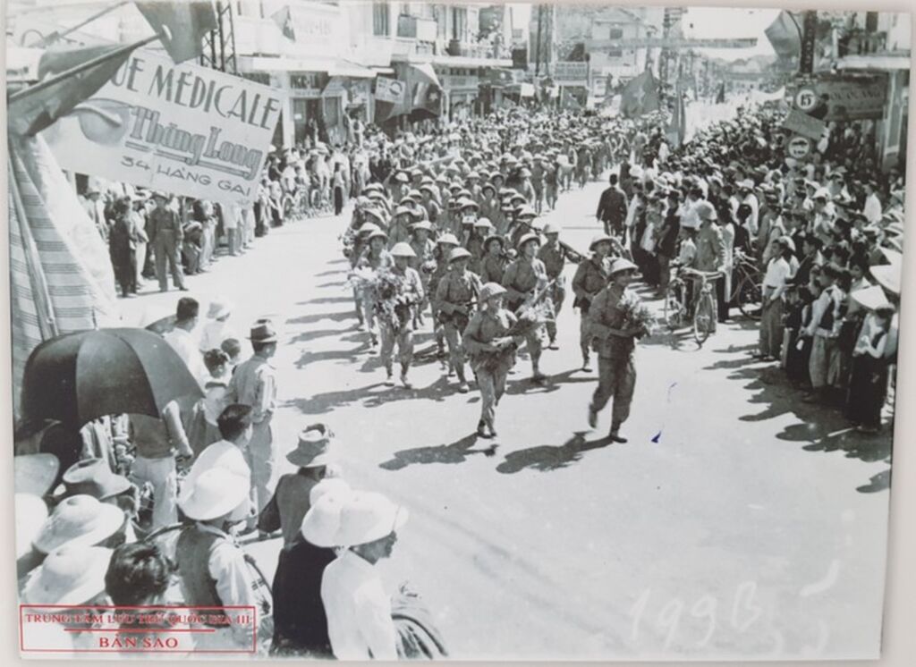 | Un régiment entre dans la capitale par la rue Hàng Gai, le 10 octobre 1954. |