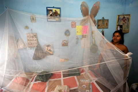 | Mara Torres, enceinte de 8 mois près de son lit entouré d'une moustiquaire, à Cali (Colombie) le 17 février. |