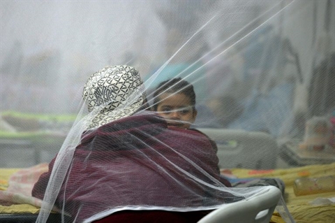| Un enfant dont le lit est entouré d'une moustiquaire à la maternité de Tegucigalpa, le 26 février. |