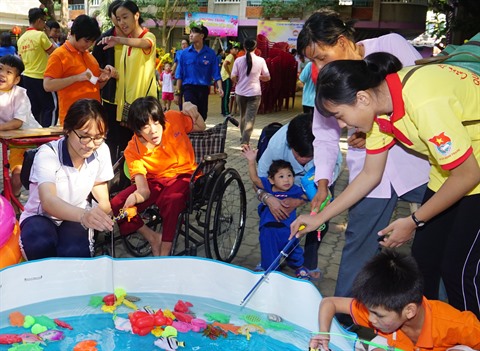 | Les enfants du Centre de protection et des soins des enfants handicapés et orphelins de Thi Nghè participent à des jeux. |