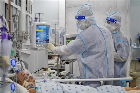 | Prise en charge d’un malade du COVID-19 à l'hôpital de l’Université de médecine et de pharmacie de Hô Chi Minh-Ville, le 30 août. |