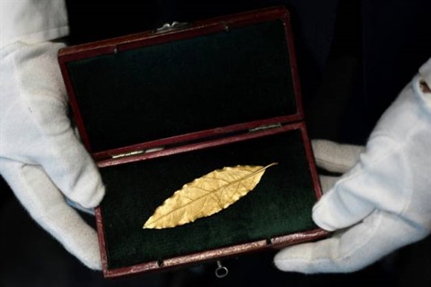 | Photographie prise le 15 novembre à Paris d'une feuille de laurier en or destinée à la couronne portée par Napoléon lors de son sacre en 1804 et adjugée, le 19 novembre, à 625.000 euros. |