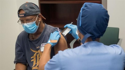 | Ce participant à l'essai clinique du vaccin de Moderna contre le COVID-19, à Detroit le 5 août, ignore s'il se fait injecter un placebo ou le vaccin expérimental. |