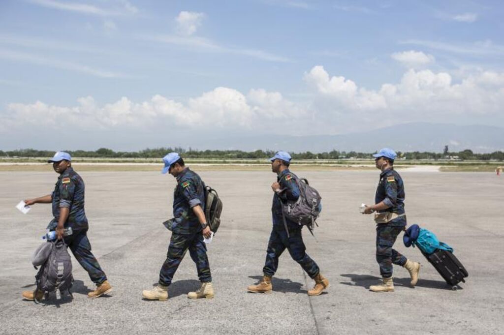 | Des Casques bleus bangladais s'apprêtent à quitter Haïti à la fin de la Minustah à l'aéroport de Port-au-Prince, le 8 octobre 2017. |