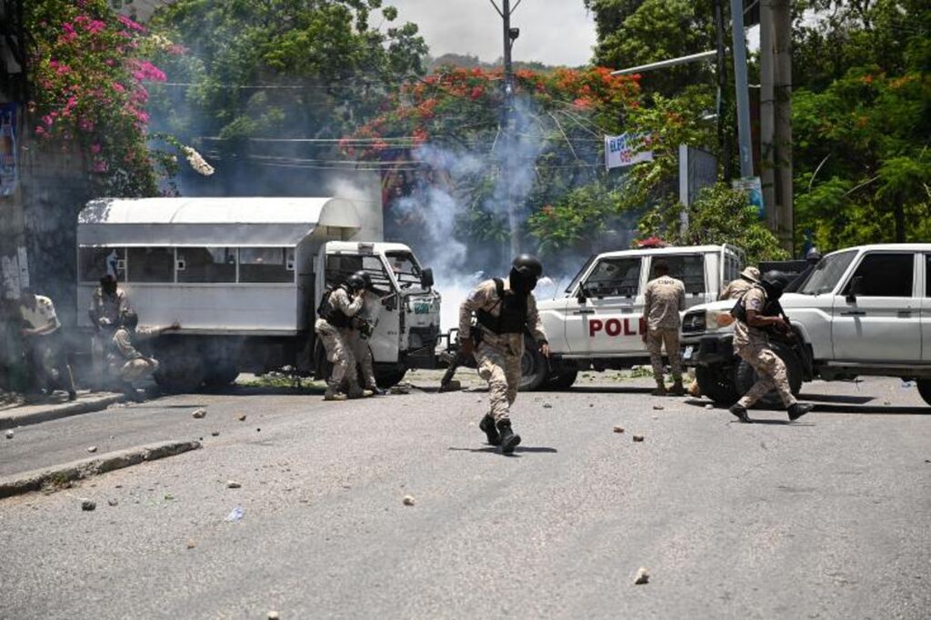 | Des agents de police haïtiens lors d'une manifestation contre l'insécurité près de la résidence du Premier ministre, à Port-au-Prince, le 7 août. |