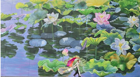 | L’artiste Nguyên Thi Thu Thuy et son chef-d'œuvre (fresque de lotus) primé par A’Design Awards & Competitions 2018-2019. |