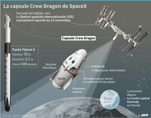Leur voyage durera 27 heures et demie, la capsule Dragon devant s'amarrer vers 04h00 GMT mardi 17 novembre à l'ISS, où se trouvent deux Russes et une Américaine. Ils y resteront six mois. Ce premier vol "opérationnel" fait suite à la mission de démonstration réussie de mai à août, lors de laquelle deux astronautes américains ont été emmenés dans l'ISS puis ramenés sur Terre sans encombre par SpaceX. Comme l'a tweeté l'astronaute européen Thomas Pesquet, le premier étage de la fusée sera réutilisé pour la mission qui l'emmènera lui et trois coéquipiers au printemps 2021 vers la station.