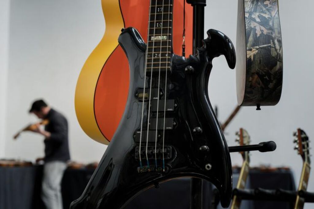| La guitare basse Warwick Buzzard à 4 cordes conçue par John Entwistle, le bassiste du groupe de rock The Who, exposée dans une salle de la maison de vente De Baecke. |