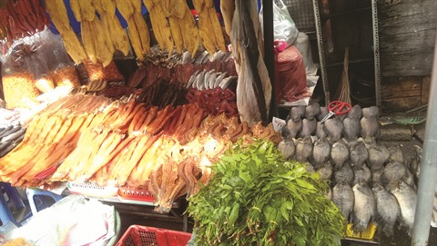 Au marché, les poissons sont rois, et on les retrouve suspendus sur les devants de nombreux stands. Chacun a sa salaison spécifique, et emprunte une caractéristique de la culture cambodgienne. On y retrouve des poissons-chats qui peuvent mesurer plus d’un demi-mètre, reconnaissables à leurs couleurs orangées criardes, de même que le danio moustachu.