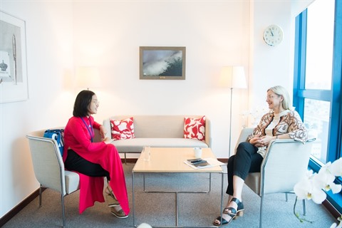 | Échange entre l’ambassadrice de Suède au Vietnam, Ann Mawe (droite), et Phuong Anh, étudiante vietnamienne de 20 ans. |