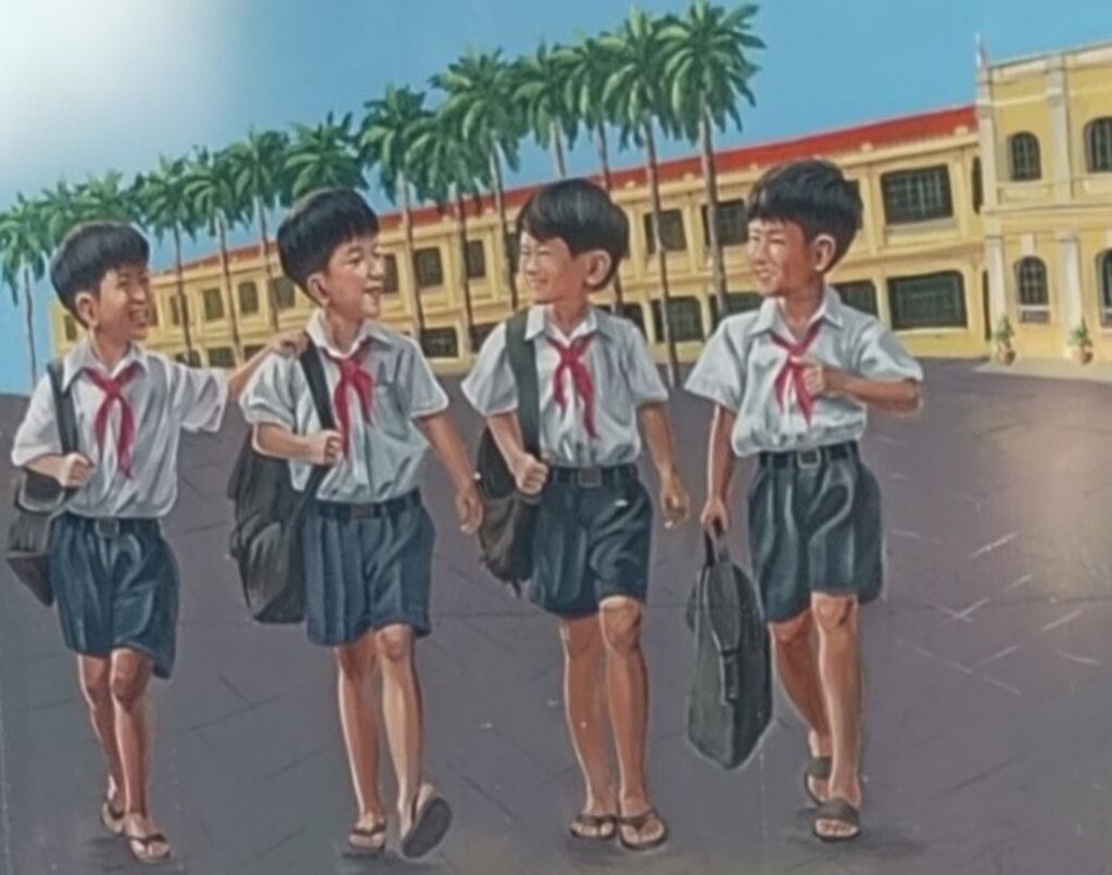 | Fresque murale d’écoliers vietnamiens sortant de l’école. |