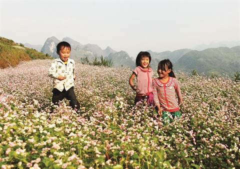 | Des enfants de Mèo Vac sur les champs de sarrasins en floraison. |