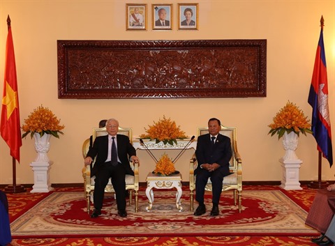 | Le secrétaire général du PCV et président vietnamien Nguyên Phu Trong (gauche) et le président du Sénat cambodgien Samdech Say Chhum, le 26 février à Phnom Penh. |