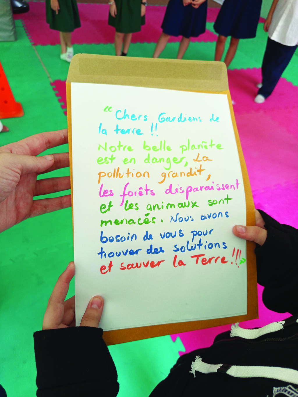 Le 3e était un atelier de réflexion sur des problématiques environnementales. Les enfants, par groupes de trois, devaient réfléchir aux causes, conséquences et solutions autour de quatre thèmes : animaux, océans, villes et forêts. Ensuite, ils ont retranscrit leurs réponses dans des bulles sur une grande affiche. Il y avait donc quatre bulles (quatre thèmes et quatre équipes), qui ont ensuite été illustrées en couleurs avec des motifs en lien avec leur thème.