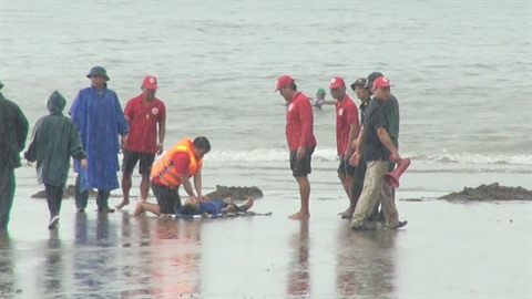 | Exercice d'intervention en cas de catastrophes naturelles mené par la Croix-Rouge de la province de Thanh Hoa conjointement avec le pouvoir et les habitants de la commune de Quang Vinh, ville de Sâm Son. |