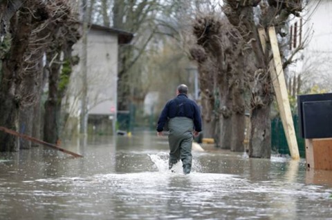 | Un homme marche dans les rues inondées de Crosne, en Essonne, le 24 janvier. |