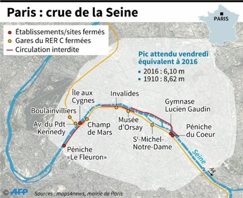 À Paris, la Seine continuait sa montée et dépassait mercredi 24 janvier 5,10 m. Elle devrait atteindre un pic dans la nuit de vendredi 26 janvier à samedi 27 janvier, à des niveaux comparables à la crue de juin 2016 (6,10 m).