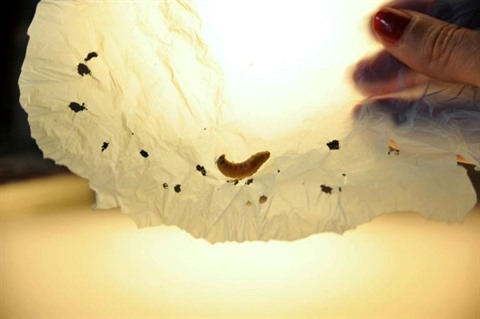 | Une photo fournie par le Centre espagnol de la recherche nationale, montrant une larve de La Fausse teigne de la cire, à Santander, en Espagne, le 17 avril |