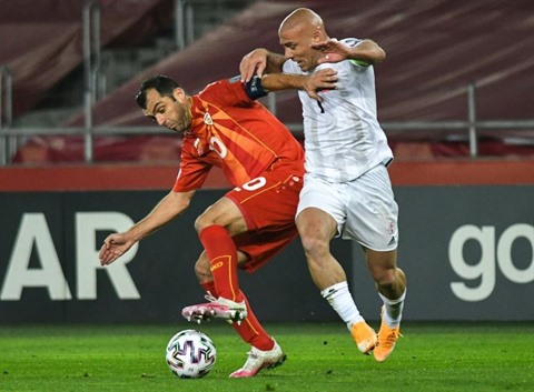 | L'attaquant nord-macédonien Goran Pandev (gauche) buteur en finale des barrages de l'Euro-2020 face à la Géorgie, à Tbilissi, le 12 novembre. |