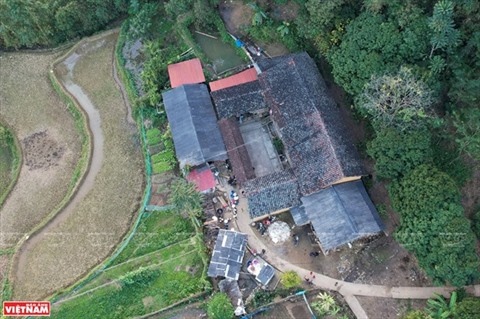 Vue d’en haut, la maison, d’une superficie de plusieurs centaines de mètres carrés, comporte trois grands blocs. Le plancher de la maison est en pierres vertes bien ciselées et taillées pour créer une base solide pour la charpente en bois de fer.