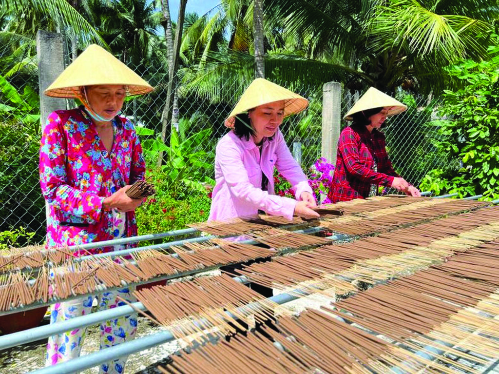 La famille de Trân Thi Anh, 60 ans, dans la commune de Hoà Lôc, district de Mo Cày, a pu sortir de la pauvreté en travaillant à l’atelier d’encens de l’enseignante Đào depuis trois ans.
