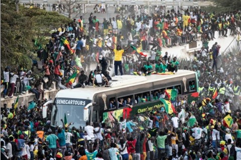 | Des supporteurs accueillent les joueurs de football sénégalais, vainqueurs de la CAN, le 7 février à Dakar. |