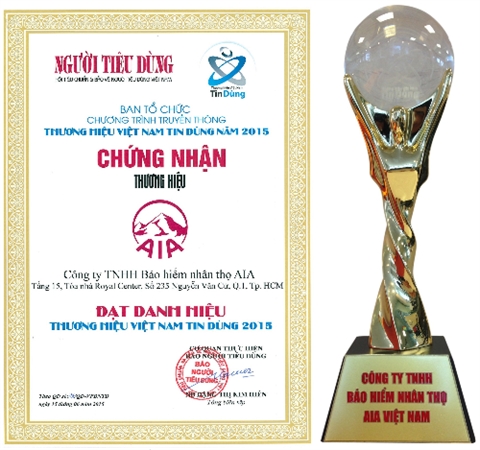 | Le trophée et le certificat «Vietnam Trustes Brand 2015» (Marque de confiance du Vietnam en 2015) pour la compagnie d'assurances AIA Vietnam. |