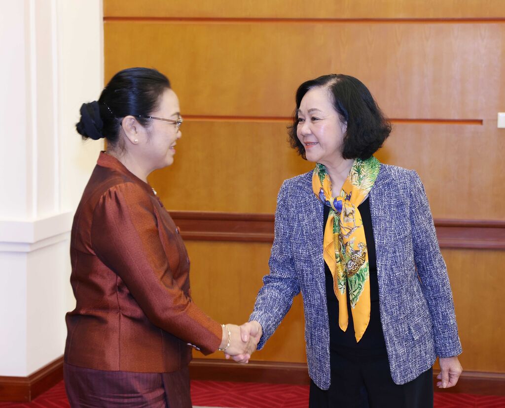 | La membre du Politburo, membre permanente du Secrétariat du Comité central du Parti, Truong Thi Mai (droite), serre la main de la nouvelle ambassadrice du Laos au Vietnam, Khamphao Ernthavanh. |