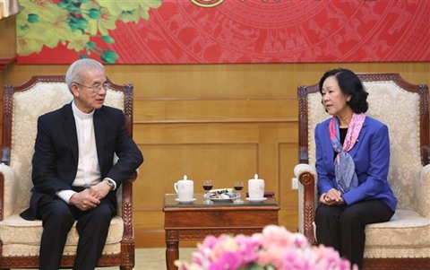 | La cheffe de la Commission centrale de sensibilisation auprès des masses du Parti, Truong Thi Mai, et le président du Comité de solidarité catholique du Vietnam, le prêtre Trân Xuân Manh, le 15 janvier à Hanoï. |