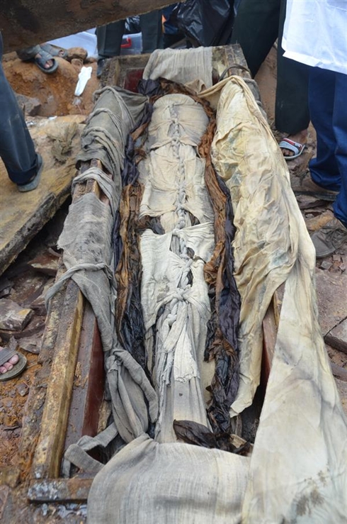 «Lorsque nous avons ouvert le couvercle, un léger parfum semblable au bois d’aigle s’est dégagé. Dans le cercueil, nous avons trouvé le cadavre d’une femme dont le corps était intact, ayant conservé ses cheveux longs et sa dentition complète de dents laquées en noir. La bouche de la momie abritait une pièce de monnaie oxydée», a expliqué le Prof.-Dr Nguyên Lân Cuong, secrétaire général de l’Association des archéologues du Vietnam.