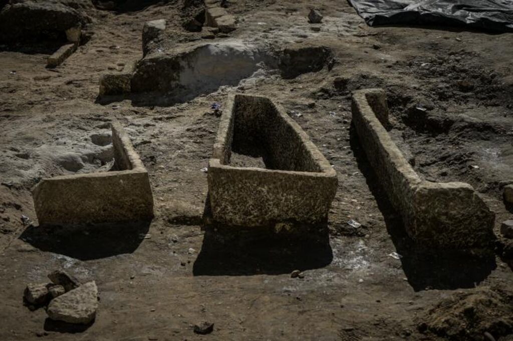 | Une grande nécropole de l'époque mérovingienne, dotée d'une cinquantaine de sarcophages, a été exhumée à Bordeaux, le 29 avril 2025. |