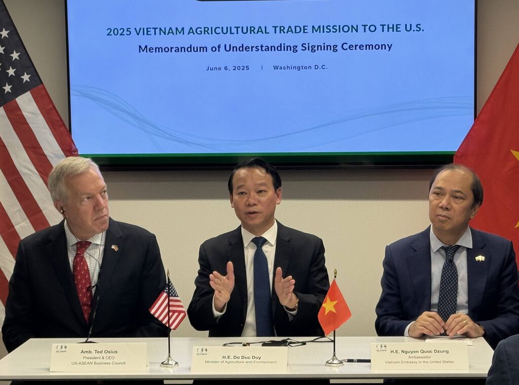 | Le ministre vietnamien de l'Agriculture et de l'Environnement, Dô Duc Duy (centre) ; le président et directeur général du Conseil des affaires États-Unis - ASEAN (USABC), Ted Osius (gauche) ; et l'ambassadeur du Vietnam aux États-Unis, Nguyên Quôc Dung. |